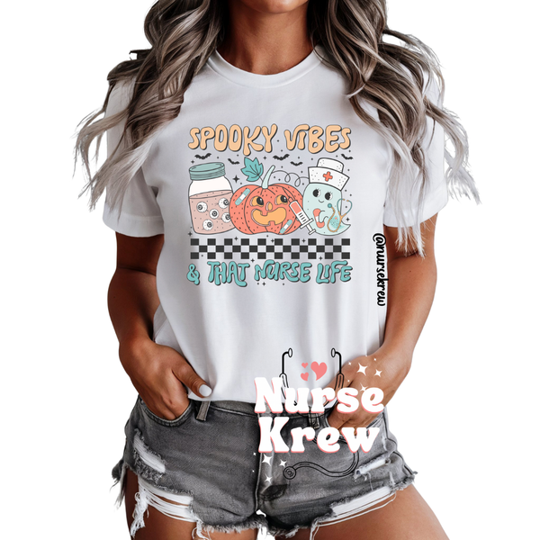 It’s giving pumpkin spice, night shift, and spooky nurse vibes! 👻 The Spooky Vibes & That Nurse Life Tee from Nurse Krew brings together everything you love about fall and the medical life. With pastel Halloween tones, a checkered accent, and the cutest ghost nurse design, this shirt is made for nurses who slay every season.